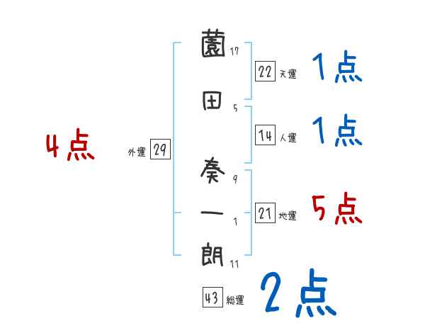 外運![]() | 薗田奏一朗さんの外運は29画の4つ星!完全主義で才能がある。厳格な心の持ち主。 生活面を象徴する運勢です。外部から受ける影響力を表し、結婚運、家庭運や職場、環境への順応性を表します。 |