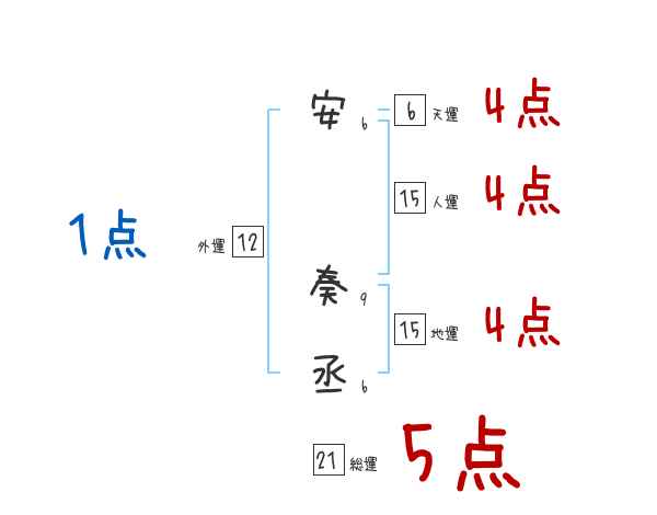 総運![]() | 安奏丞さんの総運は21画の5つ星!統率力がある。独立し成功する。名誉を手に入れる。 あなたの人生を表す1番重要な運勢です。生涯を通じて影響する総合運となり、主に50歳以降の晩年期に影響を及ぼします。 |
