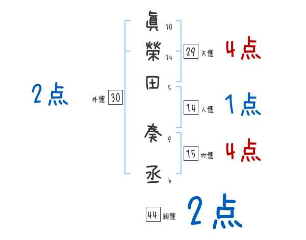 天運![]() | 眞榮田奏丞さんの天運は29画の4つ星!完全主義で才能がある。厳格な心の持ち主。 家系が持つ宿命的な運勢を表します。祖先から受け継いだ苗字ですので自分の力が及びません。家柄を象徴します。 |