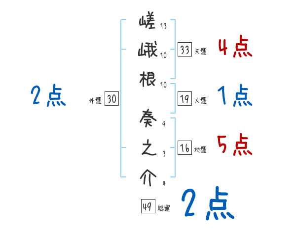 総運![]() | 嵯峨根奏之介さんの総運は49画の2つ星!不安定な性格で明暗がある人生。周りの人には支援されやすい。 あなたの人生を表す1番重要な運勢です。生涯を通じて影響する総合運となり、主に50歳以降の晩年期に影響を及ぼします。 |