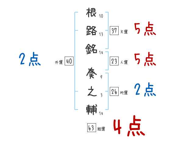 外運![]() | 根路銘奏之輔さんの外運は40画の2つ星!自信過剰で物事に固執するためトラブルに注意。 生活面を象徴する運勢です。外部から受ける影響力を表し、結婚運、家庭運や職場、環境への順応性を表します。 |