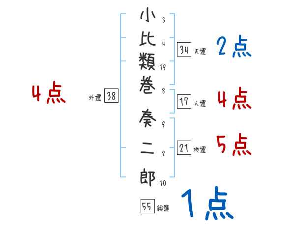 外運![]() | 小比類巻奏二郎さんの外運は38画の4つ星!温厚な性格で技術的な才能を発揮する。職人的な仕事に向いている。 生活面を象徴する運勢です。外部から受ける影響力を表し、結婚運、家庭運や職場、環境への順応性を表します。 |