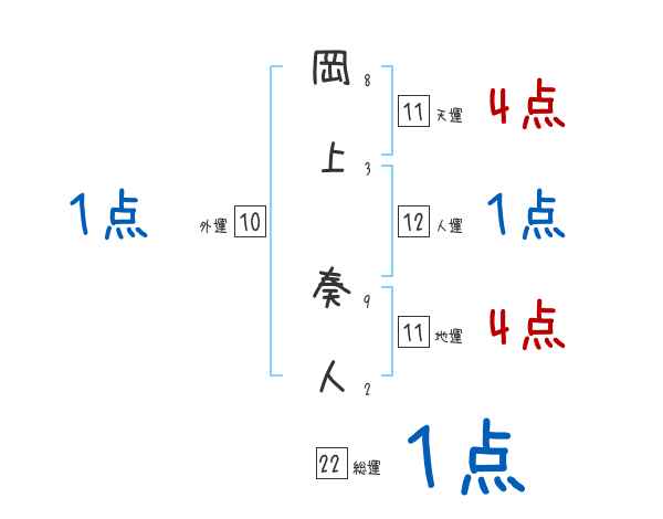 総運![]() | 岡上奏人さんの総運は22画の1つ星!努力することが苦手ないっぽう手先が器用。芸術性にも優れる。 あなたの人生を表す1番重要な運勢です。生涯を通じて影響する総合運となり、主に50歳以降の晩年期に影響を及ぼします。 |