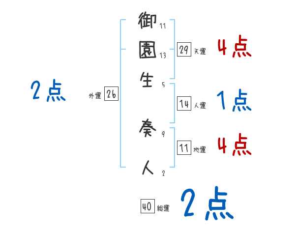 外運![]() | 御園生奏人さんの外運は26画の2つ星!波瀾万丈かも。信頼できる人を大事にしましょう。 生活面を象徴する運勢です。外部から受ける影響力を表し、結婚運、家庭運や職場、環境への順応性を表します。 |