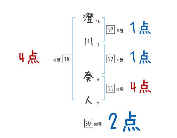 天運![]() | 澄川奏人さんの天運は19画の1つ星!優れた才能を持ちますが、協調性が足りないことも。周りの人と協力する事を意識しましょう。 家系が持つ宿命的な運勢を表します。祖先から受け継いだ苗字ですので自分の力が及びません。家柄を象徴します。 |