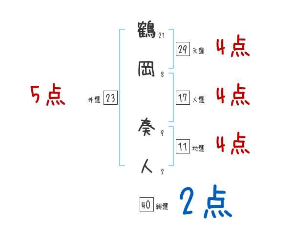 天運![]() | 鶴岡奏人さんの天運は29画の4つ星!完全主義で才能がある。厳格な心の持ち主。 家系が持つ宿命的な運勢を表します。祖先から受け継いだ苗字ですので自分の力が及びません。家柄を象徴します。 |