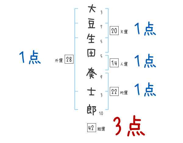 外運![]() | 大豆生田奏士郎さんの外運は28画の1つ星!家庭環境に注意。スポーツで活躍できる能力があるかも。 生活面を象徴する運勢です。外部から受ける影響力を表し、結婚運、家庭運や職場、環境への順応性を表します。 |