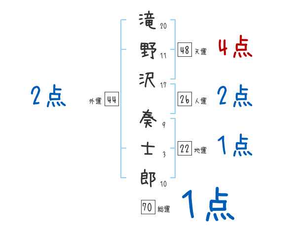 天運![]() | 滝野沢奏士郎さんの天運は48画の4つ星!賢明な性格で人望が厚い。指導力があり多くの人に尊敬される。 家系が持つ宿命的な運勢を表します。祖先から受け継いだ苗字ですので自分の力が及びません。家柄を象徴します。 |
