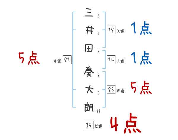 外運![]() | 三井田奏大朗さんの外運は21画の5つ星!統率力がある。独立し成功する。名誉を手に入れる。 生活面を象徴する運勢です。外部から受ける影響力を表し、結婚運、家庭運や職場、環境への順応性を表します。 |