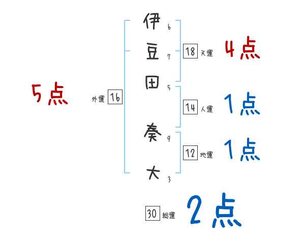 総運![]() | 伊豆田奏大さんの総運は30画の2つ星!浮き沈みの激しさに注意しましょう。 あなたの人生を表す1番重要な運勢です。生涯を通じて影響する総合運となり、主に50歳以降の晩年期に影響を及ぼします。 |