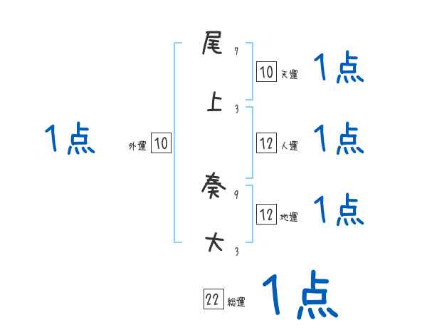 総運![]() | 尾上奏大さんの総運は22画の1つ星!努力することが苦手ないっぽう手先が器用。芸術性にも優れる。 あなたの人生を表す1番重要な運勢です。生涯を通じて影響する総合運となり、主に50歳以降の晩年期に影響を及ぼします。 |