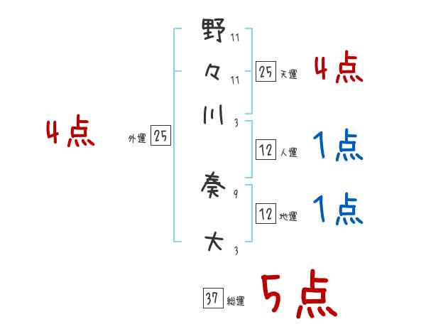 総運![]() | 野々川奏大さんの総運は37画の5つ星!努力家で順応性に優れる。現実的な考え方ができ忠実に物事をこなす。 あなたの人生を表す1番重要な運勢です。生涯を通じて影響する総合運となり、主に50歳以降の晩年期に影響を及ぼします。 |