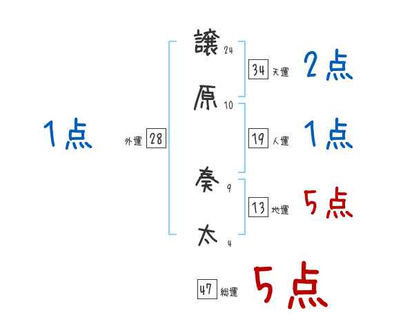 総運![]() | 譲原奏太さんの総運は47画の5つ星!実力が開花し発展する円満な人生。財に恵まれる。 あなたの人生を表す1番重要な運勢です。生涯を通じて影響する総合運となり、主に50歳以降の晩年期に影響を及ぼします。 |