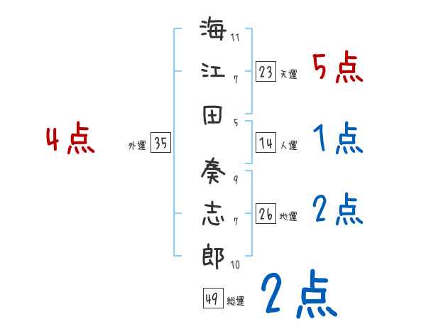 外運![]() | 海江田奏志郎さんの外運は35画の4つ星!温厚な性格で感受性が高い。穏和な性格で人望が厚い。 生活面を象徴する運勢です。外部から受ける影響力を表し、結婚運、家庭運や職場、環境への順応性を表します。 |
