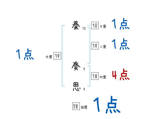 外運![]() | 秦奏思さんの外運は19画の1つ星!優れた才能を持ちますが、協調性が足りないことも。周りの人と協力する事を意識しましょう。 生活面を象徴する運勢です。外部から受ける影響力を表し、結婚運、家庭運や職場、環境への順応性を表します。 |