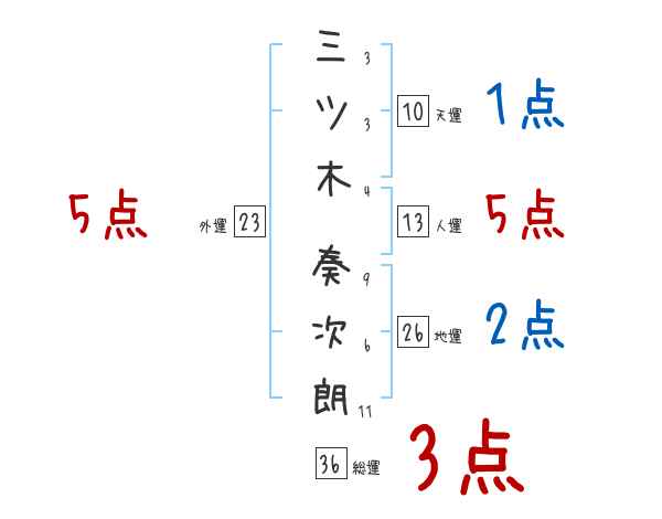 総運![]() | 三ツ木奏次朗さんの総運は36画の3つ星!先見性が豊かです。多少神経質で苦労することも。 あなたの人生を表す1番重要な運勢です。生涯を通じて影響する総合運となり、主に50歳以降の晩年期に影響を及ぼします。 |