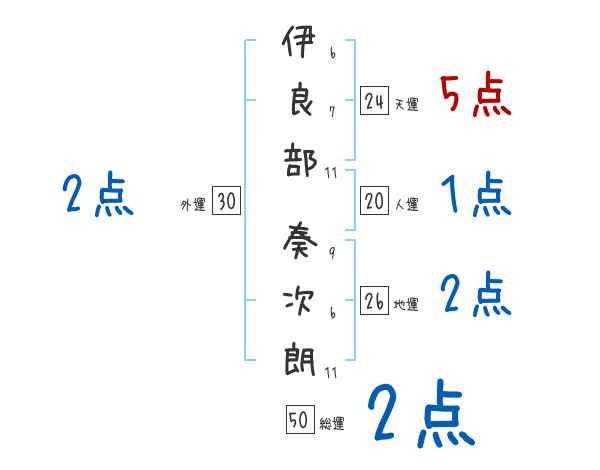 天運![]() | 伊良部奏次朗さんの天運は24画の5つ星!家庭運が良く順調な人生。金運にも恵まれる。 家系が持つ宿命的な運勢を表します。祖先から受け継いだ苗字ですので自分の力が及びません。家柄を象徴します。 |