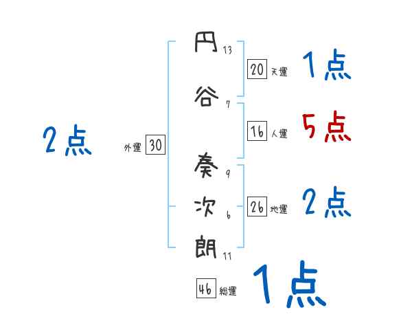 人運![]() | 円谷奏次朗さんの人運は16画の5つ星!人望が厚く大きく発展する。逆転成功が見える。 性格や才能などを表す2番目に重要な運勢です。人間関係や協調性、社会的な成功に影響します。主に20歳から50歳ぐらいまでの中年期の運勢を表します。 |