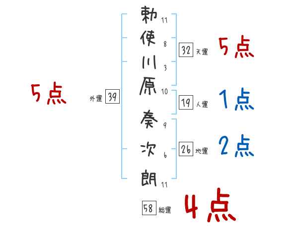 外運![]() | 勅使川原奏次朗さんの外運は39画の5つ星!社交性に優れ人望が厚い。人の上に立ち成功する。 生活面を象徴する運勢です。外部から受ける影響力を表し、結婚運、家庭運や職場、環境への順応性を表します。 |