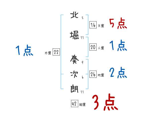 外運![]() | 北堀奏次朗さんの外運は22画の1つ星!努力することが苦手ないっぽう手先が器用。芸術性にも優れる。 生活面を象徴する運勢です。外部から受ける影響力を表し、結婚運、家庭運や職場、環境への順応性を表します。 |