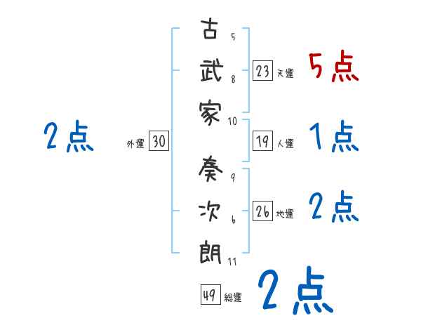 天運![]() | 古武家奏次朗さんの天運は23画の5つ星!想像力に優れ活力がある。一代で成功し名誉を手に入れる。 家系が持つ宿命的な運勢を表します。祖先から受け継いだ苗字ですので自分の力が及びません。家柄を象徴します。 |