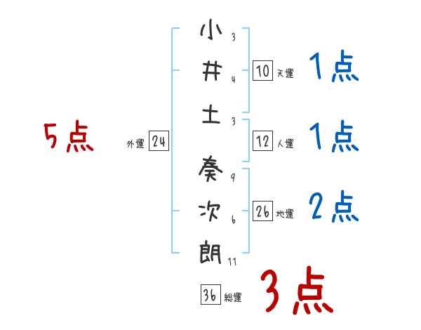 総運![]() | 小井土奏次朗さんの総運は36画の3つ星!先見性が豊かです。多少神経質で苦労することも。 あなたの人生を表す1番重要な運勢です。生涯を通じて影響する総合運となり、主に50歳以降の晩年期に影響を及ぼします。 |