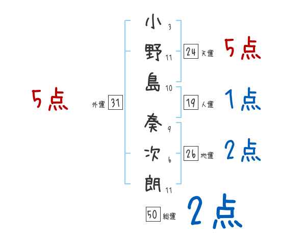 天運![]() | 小野島奏次朗さんの天運は24画の5つ星!家庭運が良く順調な人生。金運にも恵まれる。 家系が持つ宿命的な運勢を表します。祖先から受け継いだ苗字ですので自分の力が及びません。家柄を象徴します。 |