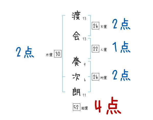 天運![]() | 渡会奏次朗さんの天運は26画の2つ星!波瀾万丈かも。信頼できる人を大事にしましょう。 家系が持つ宿命的な運勢を表します。祖先から受け継いだ苗字ですので自分の力が及びません。家柄を象徴します。 |