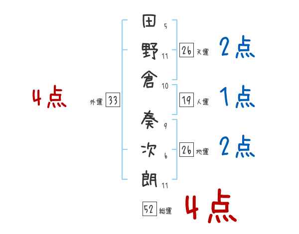 総運![]() | 田野倉奏次朗さんの総運は52画の4つ星!先見性と独創性に優れ考える力がある。強運の持ち主。 あなたの人生を表す1番重要な運勢です。生涯を通じて影響する総合運となり、主に50歳以降の晩年期に影響を及ぼします。 |
