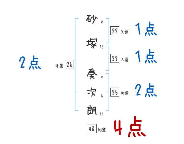天運![]() | 砂塚奏次朗さんの天運は22画の1つ星!努力することが苦手ないっぽう手先が器用。芸術性にも優れる。 家系が持つ宿命的な運勢を表します。祖先から受け継いだ苗字ですので自分の力が及びません。家柄を象徴します。 |