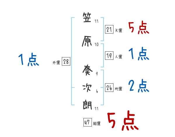 天運![]() | 笠原奏次朗さんの天運は21画の5つ星!統率力がある。独立し成功する。名誉を手に入れる。 家系が持つ宿命的な運勢を表します。祖先から受け継いだ苗字ですので自分の力が及びません。家柄を象徴します。 |