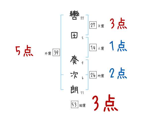 外運![]() | 轡田奏次朗さんの外運は39画の5つ星!社交性に優れ人望が厚い。人の上に立ち成功する。 生活面を象徴する運勢です。外部から受ける影響力を表し、結婚運、家庭運や職場、環境への順応性を表します。 |