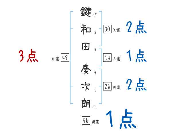 天運![]() | 鍵和田奏次朗さんの天運は30画の2つ星!浮き沈みの激しさに注意しましょう。 家系が持つ宿命的な運勢を表します。祖先から受け継いだ苗字ですので自分の力が及びません。家柄を象徴します。 |