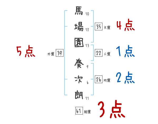 外運![]() | 馬場園奏次朗さんの外運は39画の5つ星!社交性に優れ人望が厚い。人の上に立ち成功する。 生活面を象徴する運勢です。外部から受ける影響力を表し、結婚運、家庭運や職場、環境への順応性を表します。 |