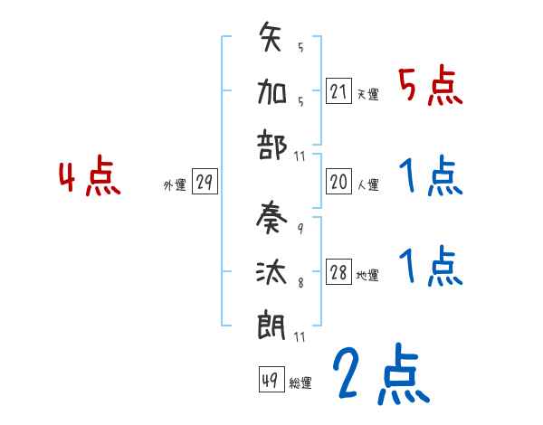 外運![]() | 矢加部奏汰朗さんの外運は29画の4つ星!完全主義で才能がある。厳格な心の持ち主。 生活面を象徴する運勢です。外部から受ける影響力を表し、結婚運、家庭運や職場、環境への順応性を表します。 |