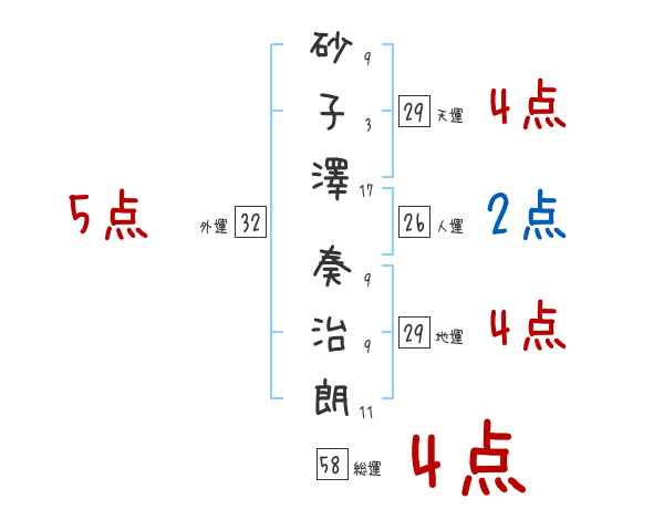 外運![]() | 砂子澤奏治朗さんの外運は32画の5つ星!柔軟性があり成功する。チャンスが多く金運が良い。 生活面を象徴する運勢です。外部から受ける影響力を表し、結婚運、家庭運や職場、環境への順応性を表します。 |