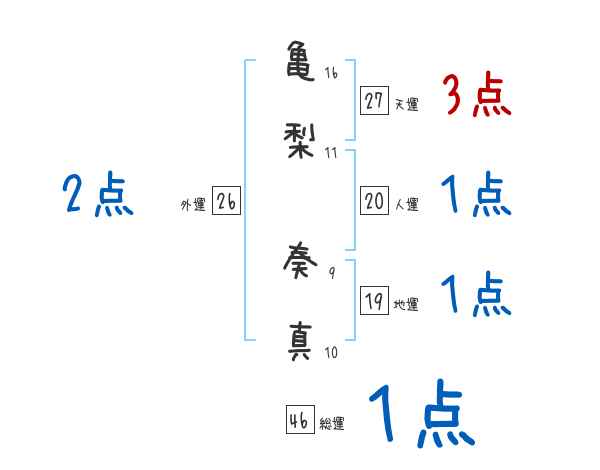 外運![]() | 亀梨奏真さんの外運は26画の2つ星!波瀾万丈かも。信頼できる人を大事にしましょう。 生活面を象徴する運勢です。外部から受ける影響力を表し、結婚運、家庭運や職場、環境への順応性を表します。 |