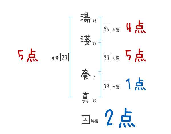 外運![]() | 湯淺奏真さんの外運は23画の5つ星!想像力に優れ活力がある。一代で成功し名誉を手に入れる。 生活面を象徴する運勢です。外部から受ける影響力を表し、結婚運、家庭運や職場、環境への順応性を表します。 |