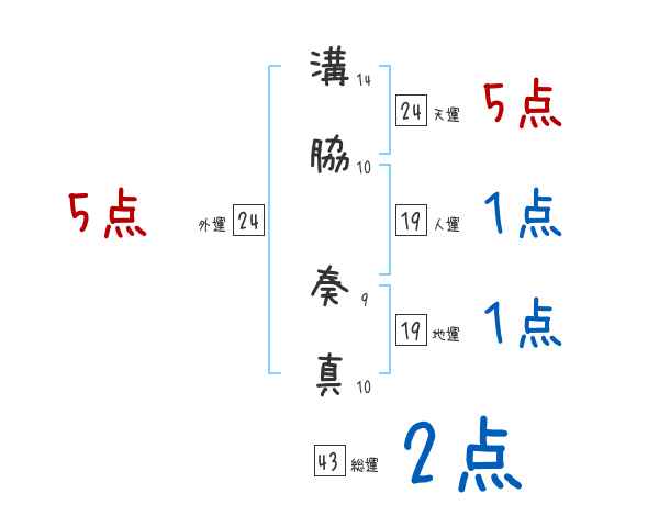 天運![]() | 溝脇奏真さんの天運は24画の5つ星!家庭運が良く順調な人生。金運にも恵まれる。 家系が持つ宿命的な運勢を表します。祖先から受け継いだ苗字ですので自分の力が及びません。家柄を象徴します。 |