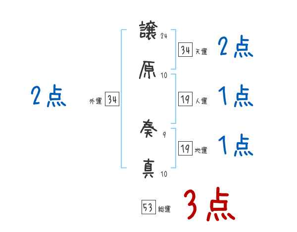 天運![]() | 譲原奏真さんの天運は34画の2つ星!独創性に優れるが、自尊心が強く災難に注意しましょう。 家系が持つ宿命的な運勢を表します。祖先から受け継いだ苗字ですので自分の力が及びません。家柄を象徴します。 |