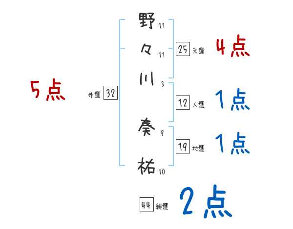 外運![]() | 野々川奏祐さんの外運は32画の5つ星!柔軟性があり成功する。チャンスが多く金運が良い。 生活面を象徴する運勢です。外部から受ける影響力を表し、結婚運、家庭運や職場、環境への順応性を表します。 |