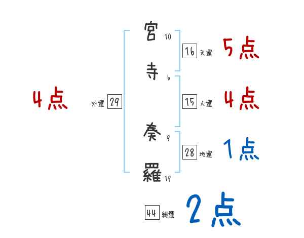 総運![]() | 宮寺奏羅さんの総運は44画の2つ星!誠実で慎重な性格。物事を考えすぎないように注意しましょう。 あなたの人生を表す1番重要な運勢です。生涯を通じて影響する総合運となり、主に50歳以降の晩年期に影響を及ぼします。 |