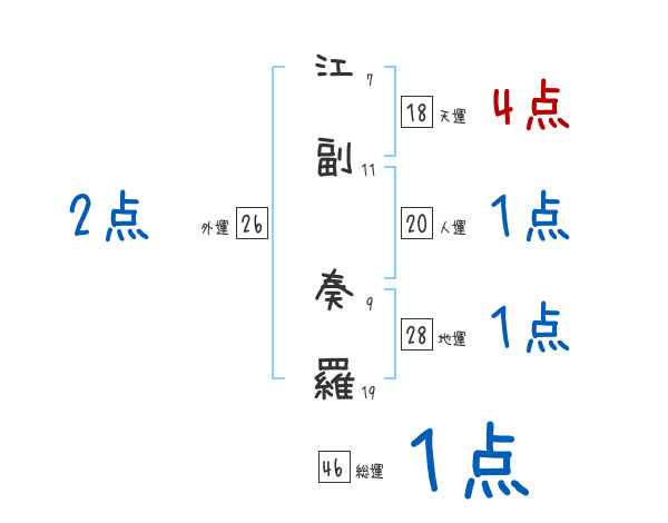 外運![]() | 江副奏羅さんの外運は26画の2つ星!波瀾万丈かも。信頼できる人を大事にしましょう。 生活面を象徴する運勢です。外部から受ける影響力を表し、結婚運、家庭運や職場、環境への順応性を表します。 |