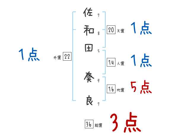 総運![]() | 佐和田奏良さんの総運は36画の3つ星!先見性が豊かです。多少神経質で苦労することも。 あなたの人生を表す1番重要な運勢です。生涯を通じて影響する総合運となり、主に50歳以降の晩年期に影響を及ぼします。 |