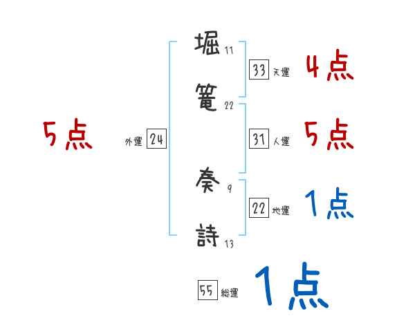 外運![]() | 堀篭奏詩さんの外運は24画の5つ星!家庭運が良く順調な人生。金運にも恵まれる。 生活面を象徴する運勢です。外部から受ける影響力を表し、結婚運、家庭運や職場、環境への順応性を表します。 |