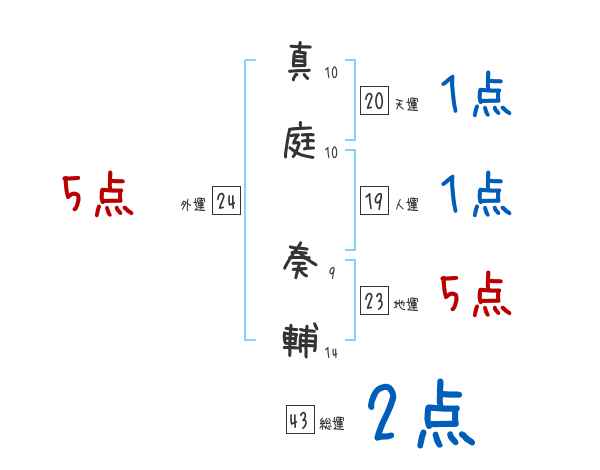 外運![]() | 真庭奏輔さんの外運は24画の5つ星!家庭運が良く順調な人生。金運にも恵まれる。 生活面を象徴する運勢です。外部から受ける影響力を表し、結婚運、家庭運や職場、環境への順応性を表します。 |