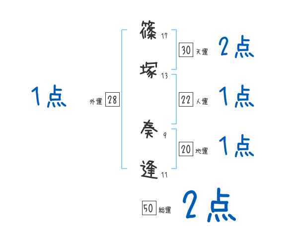 天運![]() | 篠塚奏逢さんの天運は30画の2つ星!浮き沈みの激しさに注意しましょう。 家系が持つ宿命的な運勢を表します。祖先から受け継いだ苗字ですので自分の力が及びません。家柄を象徴します。 |