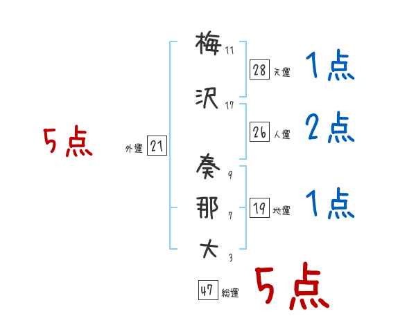 総運![]() | 梅沢奏那大さんの総運は47画の5つ星!実力が開花し発展する円満な人生。財に恵まれる。 あなたの人生を表す1番重要な運勢です。生涯を通じて影響する総合運となり、主に50歳以降の晩年期に影響を及ぼします。 |