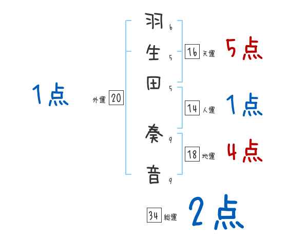 総運![]() | 羽生田奏音さんの総運は34画の2つ星!独創性に優れるが、自尊心が強く災難に注意しましょう。 あなたの人生を表す1番重要な運勢です。生涯を通じて影響する総合運となり、主に50歳以降の晩年期に影響を及ぼします。 |
