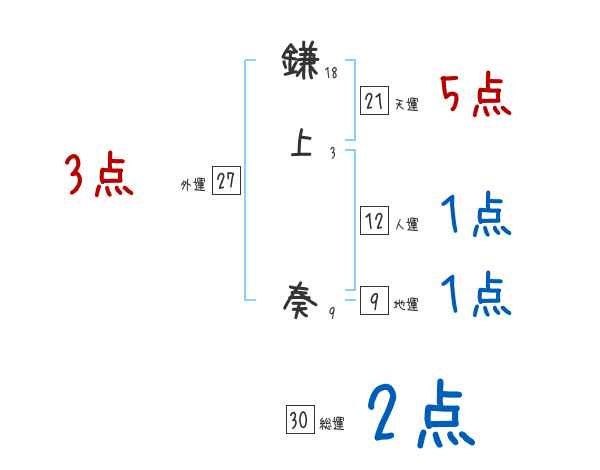 天運![]() | 鎌上奏さんの天運は21画の5つ星!統率力がある。独立し成功する。名誉を手に入れる。 家系が持つ宿命的な運勢を表します。祖先から受け継いだ苗字ですので自分の力が及びません。家柄を象徴します。 |